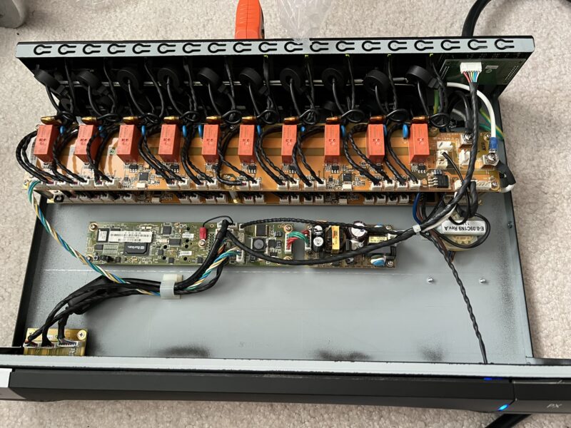 The logic board connects to the top outlet control board on the left. The top board connects to the bottom board on the right side of the unit, and then the bottom board has a terminator resistor on the left. The logic board also connects to the LED display on the rear of the unit, the serial/feature/LAN ports on the front-left of the unit, and the blue LED on the front-right.